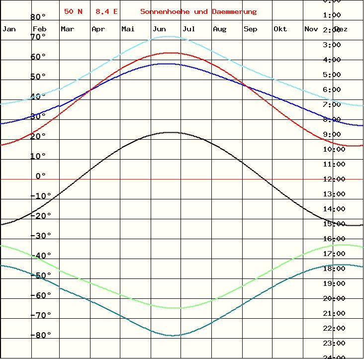 Sie ist der höchste Punkt (obere Kulmination) den die Sonne im Laufe des Tages erreicht. Wenn der Wert negativ ist, geht die Sonne nie auf (Polarnacht) - Deklination ° Ist nicht von der Uhrzeit abhängig